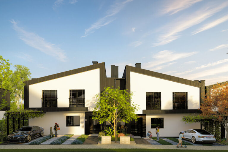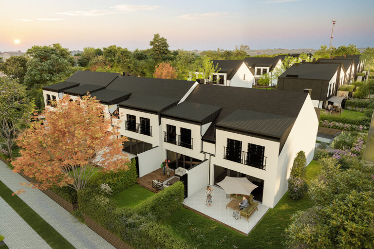 Scandinavia to kameralne osiedle 28 domów w zabudowie bliźniaczej i szeregowej, zaprojektowane w tarasowym układzie, wpisanym w naturalny spadek terenu, jako spójna, harmonijna całość, inspirowana estetyką północnej Europy. Proste, geometryczne bryły, jasne elewacje w odcieniu kości słoniowej, grafitowe dachy, naturalne drewno oraz duże przeszklenia tworzą ponadczasową kompozycję, w której kluczową rolę odgrywają światło i proporcje.