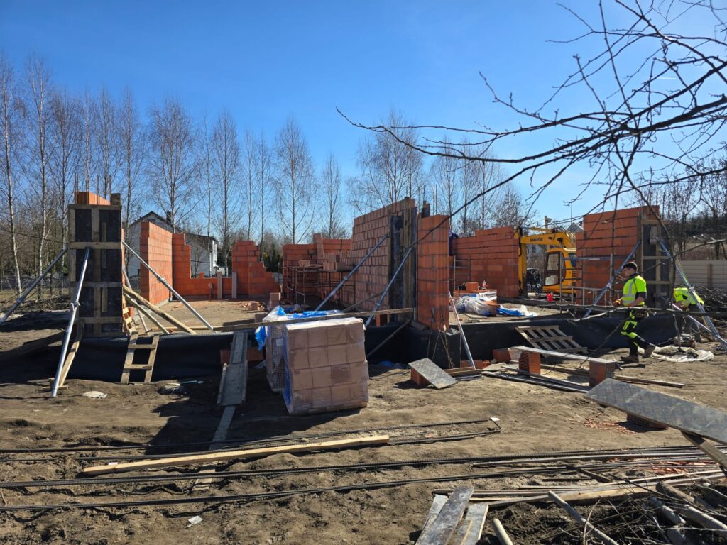 Na początku marca rozpoczęliśmy kolejny etap budowy – roboty murowe parteru. W pierwszych budynkach układane są już pierwsze warstwy ścian nośnych, które stopniowo wyznaczają przyszły układ przestrzeni domów.
